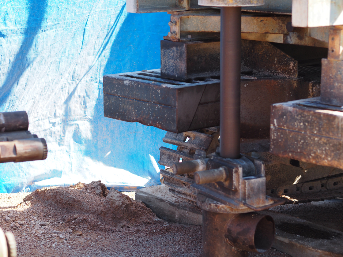 1本3mのロッドを何本継ぎ足したかで深さの進行状況を確認し、地上に吹き上がってくる泥や石を見て