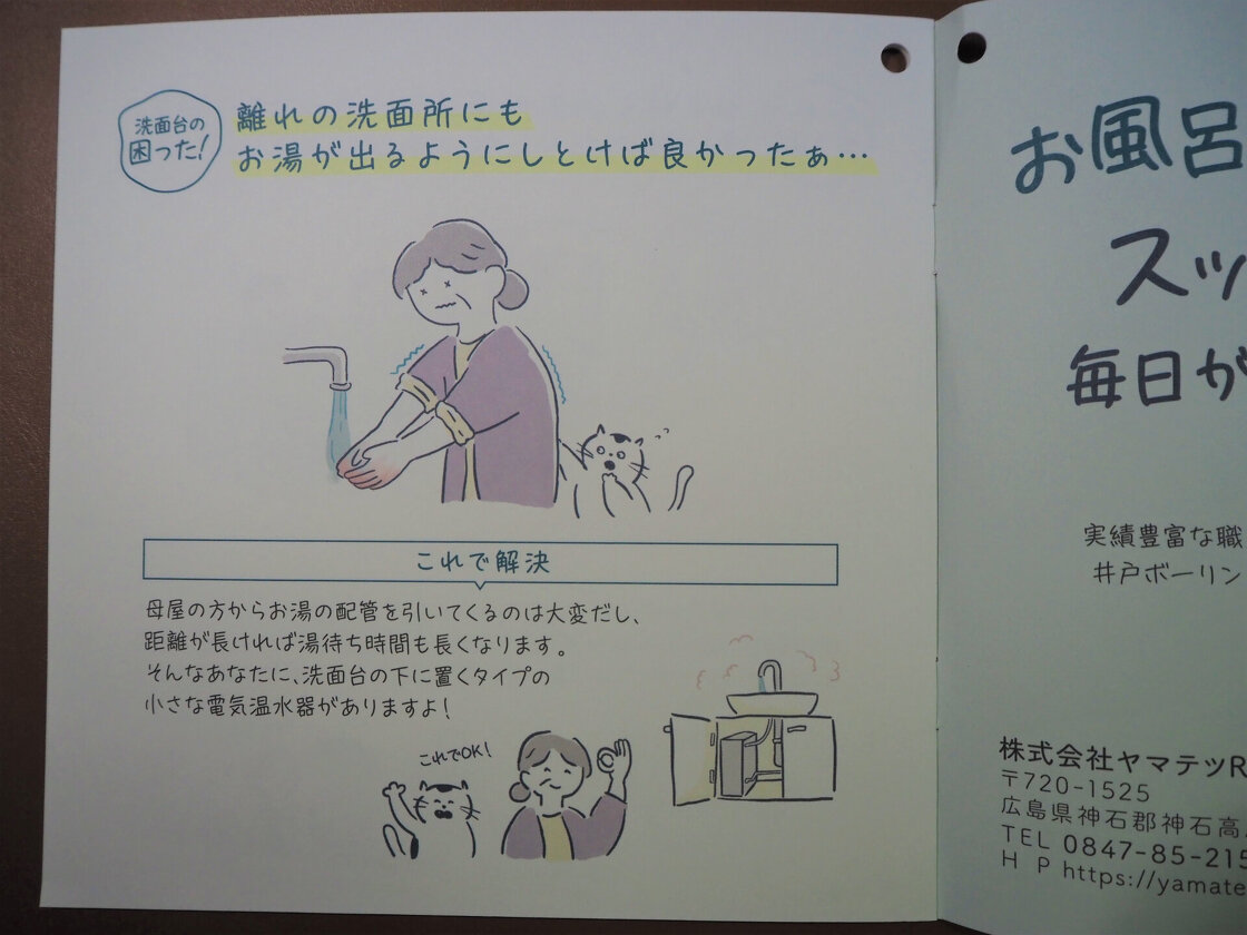 洗面台の下の収納スペースの中へ電気給湯器を備え付けますので、お水しか出なかった手洗の場所でも、お湯が使えるようになります。